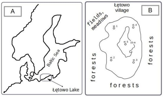 Lake Łętowskie is located in northern Poland in the Pomerania region. It is an important part of the Protected Landscape Area “Lake Łętowskie and the vicinity of Kępice” (Journal of Laws of the Słupsk Voivodeship No. 9, item 23). The Protected Landscape Area “Lake Łętowskie and the vicinity of Kępice” is characterized by high forest cover, amounting to 76% []. Around most of the marshy shores of the lake, there is an ash–alder riparian forest and an alder forest [].