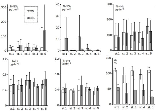 The oxygenation of the NBL of lake Łętowskie in the studied period was on average 41.3% (Figure 3). At sites 1 to 4 of lake Łętowskie, the saturation of the NBL water with oxygen was close to 50%, which could have promoted nitrification processes. The observed high value of N-NO2 at site 1 (10.8 µg dm−3) probably indicates high dynamics of nitrification processes. These constituents are intermediate products of the nitrogen cycle and are caused mainly by the oxidation of N-NH4 in the nitrification process [].