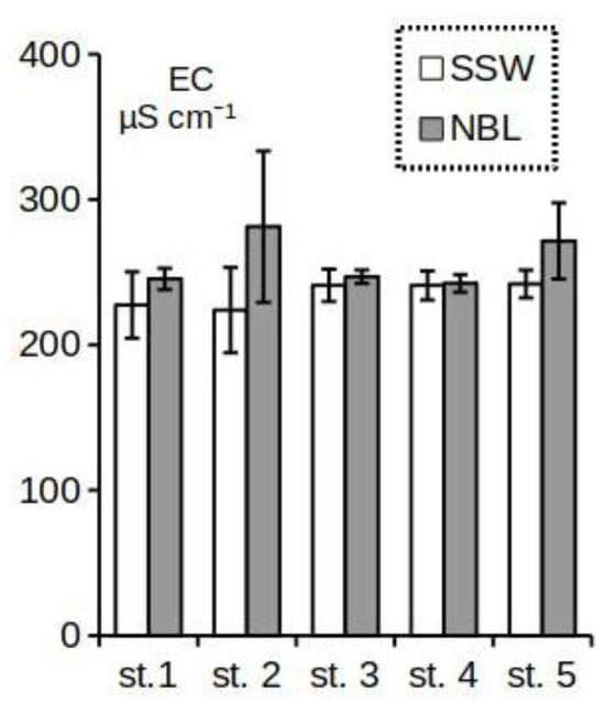 Electric conductivity in the SW and NBL at the selected sampling stations in lake Łętowskie.