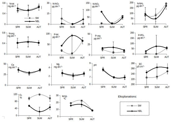 In spring, the highest N-NO3 concentrations were observed in the NBL, with a significant decrease in N-NO3 concentrations in summer and a renewed increase in autumn. In SW, however, the concentrations were the lowest in spring and then systematically increased in summer and autumn. For N-NO2, the opposite distribution of concentrations to those for N-NO3 was noted. Here, the highest concentrations were observed in spring in the SW, with a decrease in summer and autumn, while in the NBL, the lowest concentration was noted in spring, with a systematic increase until autumn. The seasonal distribution of the pH was similar to the distributions of the Ca and Mg concentrations. The level of water oxygen saturation was lower in the SW, with a minimum in summer, while at the same time, the maximum values were observed in the SW, while the highest EC was observed in summer in the NBL and the lowest values were seen in spring in SW.