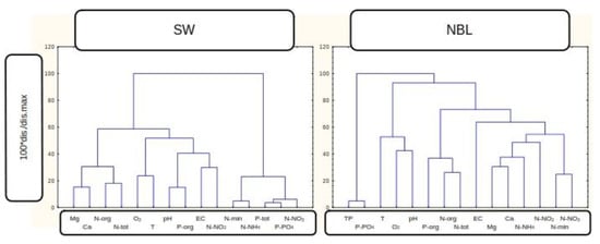 A multivariate cluster analysis was carried out (Figure 7). Based on this analysis, it is visible that the studied SW and NBL differ fundamentally in terms of chemistry and show different correlations between the studied chemical components. The multivariate cluster analysis provides information that the near-bottom waters (NBL) are connected by matter transport processes with the bottom sediments. The P-tot and P-PO4 compounds are closely connected with each other, which may result from the release of these compounds from the bottom sediments of the lake (Figure 7). Also, mineral forms of nitrogen, N-NH4 and N-NO2, N-NO3, and Ca and Mg formed a common cluster, which probably results from the mineralization processes of organic matter at the bottom of the lake.