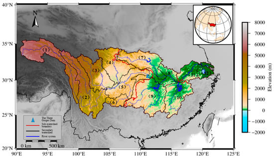 The YRB ranks as the largest river system in China and the third longest worldwide. Its drainage basin covers approximately 1.8 million km2, representing about 18.8% of the country’s total land area. The river originates from the main peak of the Tanggula Mountains on the Qinghai–Tibet Plateau. Its mainstream, together with numerous tributaries, traverses up to 19 provinces, with the trunk channel extending nearly 6300 km in length. The latitudinal and longitudinal coordinates of the basin span a range from 90°32′ to 121°56′ E and 24°28′ to 35°46′ N, respectively. The elevation span in the basin is vast, from −70 m to 6444 m. The basin’s terrain is structured in three distinct tiers, displaying a predominant gradient from higher elevations in the west to lower elevations in the east. Accordingly, it is conventionally divided into the upper, middle, and lower reaches. The upper reaches of the YRB, extending from the river’s source to Yichang in Hubei Province, are mainly composed of alpine mountains with an average altitude of about 5100 m. The middle reaches stretch from Yichang to Hukou, characterized by scattered alluvial plains and undulating low hills, with an average elevation of less than 200 m above sea level. The lower segment runs from Hukou to Chongming Island in the east, encompassing densely settled and highly urbanized regions along both the mainstream and its distributaries.