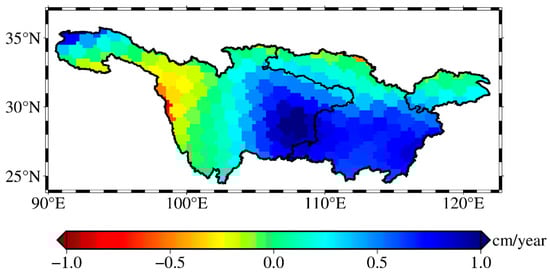 Figure 2 shows spatial distribution of TWSA trend in the YRB during the study period. Overall, TWSA shows an increasing tendency, with particularly pronounced growth observed in the eastern upper reaches and the middle reaches, where the rate exceeds 5 mm/year. Nevertheless, the spatial distribution is heterogeneous. Since the 1960s, the Qinghai–Tibet Plateau has experienced a sustained warming trend, which has accelerated glacier ablation in the region. For instance, the melting of glaciers in the Tanggula Mountains has led to a reduction in terrestrial water storage in the central-western upper reaches of the YRB, at an approximate rate of −5 mm/year. At the same time, the substantial input of meltwater from snow and ice has effectively replenished TWS in other parts of the basin.