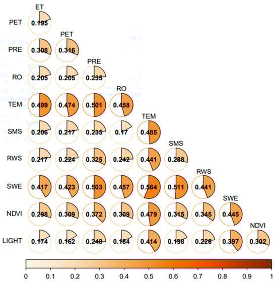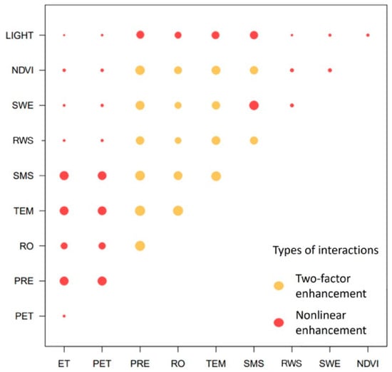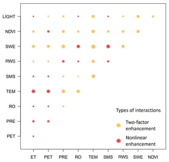 The results of interaction analysis among the driving variables are presented in Figure 4. As shown, all pairwise interactions between driving factors yield stronger explanatory power for the upstream TWSA trend compared to individual factors. In particular, TEM and SWE exhibit markedly stronger impacts when interacting with other variables, highlighting their pivotal role in driving long-term TWSA changes in the upper YRB.