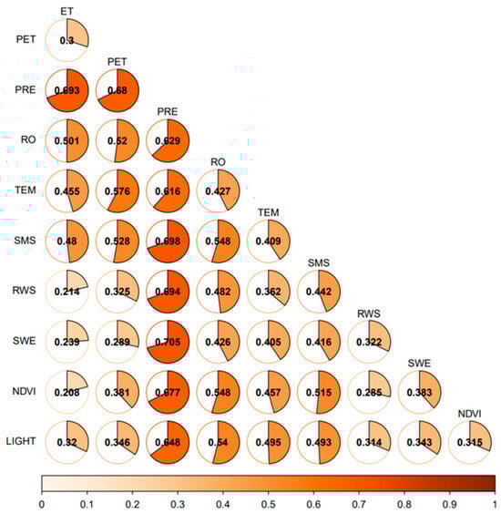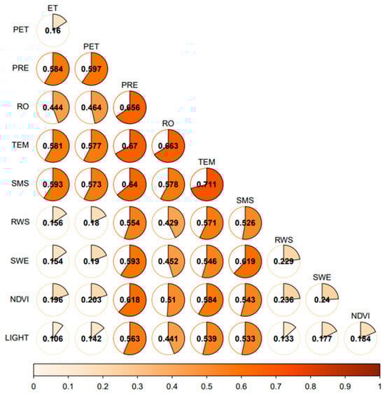 Climatic variables such as TEM (Q = 0.2155) and PET (Q = 0.2028) also show moderate influence. RWS, although highly managed in this region, ranks slightly lower (Q = 0.1998), possibly due to spatial averaging effects or the regulatory function of major reservoirs buffering TWSA fluctuations. NDVI, SWE, and ET exhibit relatively weak explanatory power, with Q values of 0.1132, 0.1047, and 0.0888, respectively. This is consistent with the region’s subtropical humid climate, low cryospheric influence, and dense human-altered landscapes.