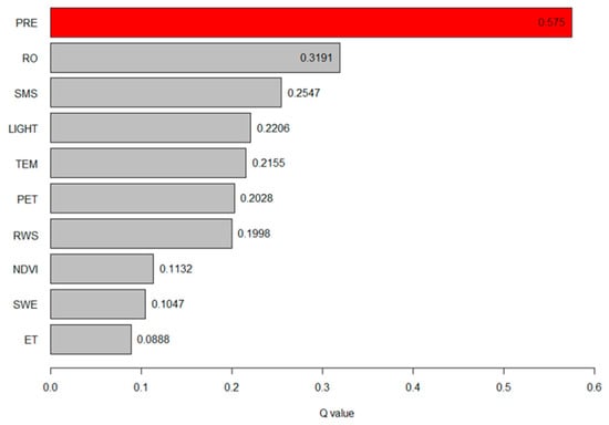 Anthropogenic factors exhibited moderate explanatory power. RWS had a Q value of 0.1531, reflecting the role of managed water infrastructure in regulating basin-scale hydrology. In contrast, LIGHT, a proxy for human settlement and activity intensity, showed relatively low influence (Q = 0.092).