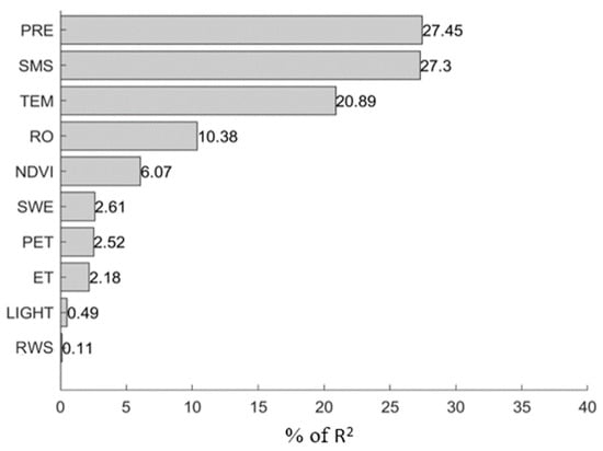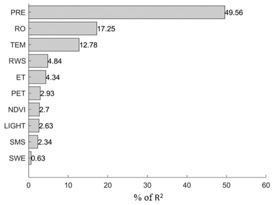 Figure 13 presents the contribution rates of various factors, as calculated using the LMG method, for the middle YRB. PRE, SMS, TEM, and RO together explain over 80% of the total contribution to TWSA trend variations. Importantly, the four dominant factors identified by the LMG method are consistent with the top four most influential single factors revealed by the GeoDetector model, suggesting strong agreement between the two approaches in this region.
