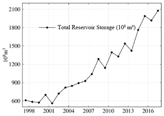 Changes in total reservoir storage in the YRB since 1997 (from the Yangtze River Water Resources Commission).