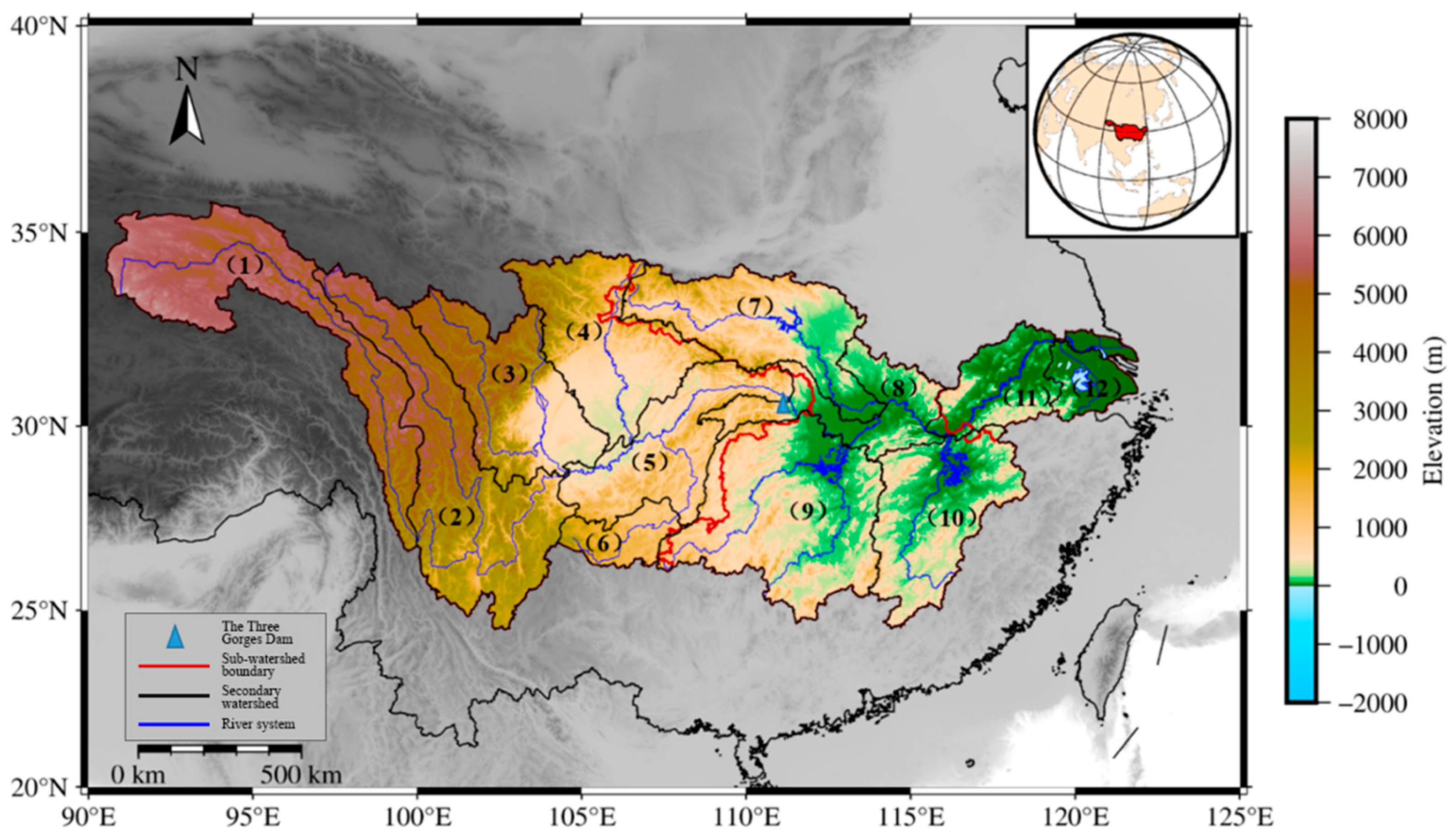 - Zhao, Y.; Zou, X.; Liu, Q.; Yao, Y.; Li, Y.; Wu, X.; Wang, C.; Yu, W.; Wang, T. Assessing natural and anthropogenic influences on water discharge and sediment load in the Yangtze River, China. Sci. Total Environ. 2017, 607, 920–932. [Google Scholar] [CrossRef]