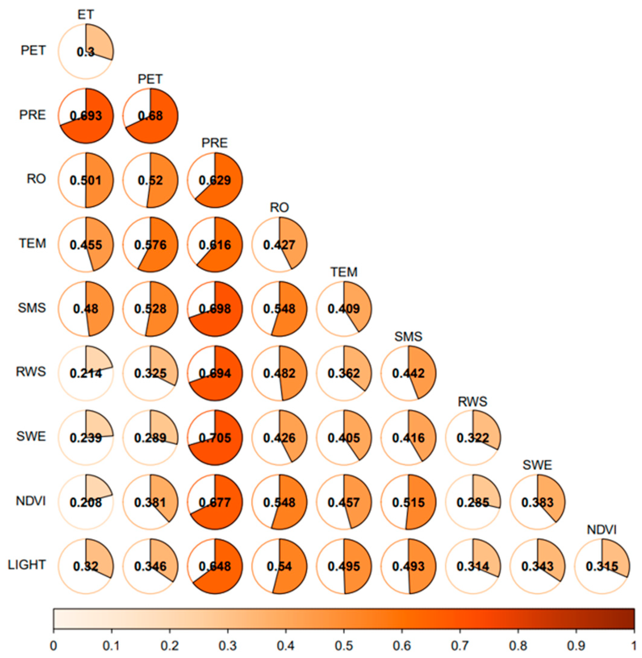 | Natural factors | Soil moisture storage | SMS | Monthly | 0.1° × 0.1° | FLDAS Noah [29] |