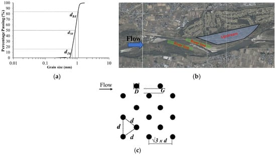 (a) Grain size distribution, (b) aerial view of vegetated alternate bars, Arakawa River (modified from an aerial photo by the Geospatial Information Authority of Japan), and (c) arrangement of staggered cylinders in which G is the cross-stream clear spacing between cylinders, d is the center to center spacing between cylinders, and D is the scaled cylinder diameter.