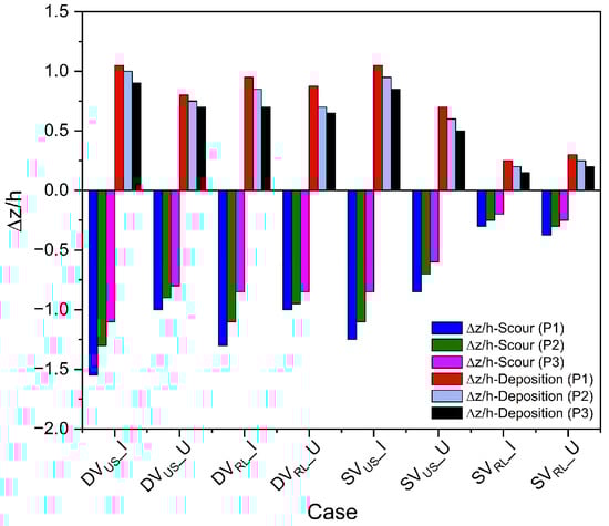 Figure 10 presents the dimensionless bed elevation changes (Δz/h), providing a normalized comparison across all configurations. For each case, the values correspond to the maximum scour and deposition measured in the local bar pool domain surrounding the frontal areas of P1, P2, and P3, as shown in Figure 6, Figure 7 and Figure 8. Among Patch 1 results, the upstream vegetation with I-type debris cases, such as DVUS_I and SVUS_I, exhibited the highest morphological response, with normalized scour reaching −1.55 and deposition exceeding +1.05. River line vegetation with I-type debris (DVRL_I) also had a strong impact (approximate scour −1.30, deposition +0.95), whereas U-type debris led to slightly lower responses (for example, DVUS_U has −1.0 scour and +0.8 deposition).