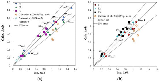 As shown in Figure 11a (scour) and Figure 11b (deposition), the empirical relationship reproduces results within the ±20% corridor, deposition is essentially unbiased, while scour is slightly under-predicted. The small offsets are consistent with (i) metric differences (bar-scale amplitude vs. local scour), (ii) depth normalization (very shallow h in [] vs. deep h in [], and (iii) blockage definition (frontal-density or length-based measures mapped to our area-based Br).