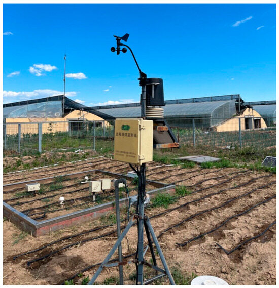 The National Precision Agriculture Demonstration Center is located at 40.18° N latitude and 116.45° E longitude, experiencing a warm, temperate climate that is semi-humid and semi-arid with monsoon influences. The annual average temperature ranges from 11 °C to 13 °C, and annual precipitation varies between 500 and 700 mm. In the experimental field, a fixed WS-1802 remote meteorological station was installed. This meteorological automatic monitoring field equipment is designed for automatic data collection, storage, and remote transmission. The WS-1802 measures a range of meteorological parameters, including the following: temperature, with a measurement range of −40 °C to 65 °C and an accuracy of ±0.2 °C; humidity, with a measurement range of 0–100% RH and an accuracy of ±1.5% RH; wind speed, with a measurement range of 0–67 m/s and an accuracy of ±1 m/s; and net radiation intensity, with a measurement range of 0–20,000 W/m2 and a resolution of 1 W/m2. The station was set to automatically collect meteorological data every minute. The meteorological station was installed according to the recommended method by the FAO, and its on-site installation is shown in Figure 1.