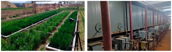 Winter wheat was planted directly in lysimeter cultivation tanks, each measuring 1 m in length and 0.75 m in width. Four rows of wheat were planted per tank, with 100 seeds sown in each row. A drip irrigation line was installed every two rows, connected to a digital water meter for precise irrigation control. Beneath each cultivation tank, a weight measurement module was installed to automatically record daily weight changes of the wheat every 5 min. Irrigation started on 16 April 2023 and ended on 8 June 2023. The experimental layout is shown in Figure 2.