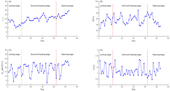 From the daily temperature change curve (Figure 3A) in the experimental area, it is observed that the temperature increased through the jointing, booting and heading, and ripening stages (Each stage is separated by dashed lines). The average temperatures for the respective stages were 14.48 °C, 20.18 °C, and 27.15 °C. According to the daily humidity change curve (Figure 3B), there was a gradual increase in humidity, with values of 52.36% during the jointing stage, 58.2% at the booting and heading stages, and 60.5% at maturity. The daily cumulative net solar radiation change curve (Figure 3C) shows a gradual increase in net solar radiation, with averages of 15.01 MJ m−2d−1, 18.19 MJ m−2d−1, and 23.46 MJ m−2d−1 for the respective stages. The daily wind speed variation curve (Figure 3D) indicates relatively stable wind speeds, averaging 1.34 m/s, 1.19 m/s, and 1.3 m/s during the jointing, booting and heading, and ripening stages, respectively.