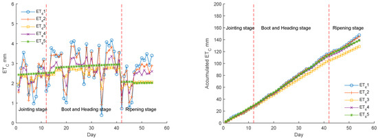 Figure 4 shows the ETC values obtained from different treatments in the experimental area. The total irrigation amount for treatment T1 is 147.68 mm, with 27.4 mm during the jointing stage, 88.67 mm during the flowering and grouting stages, and 31.61 mm during the maturity stage (Each stage is separated by dashed lines). The total irrigation amount of the T2 treatment is 145.33 mm, with an irrigation amount of 27.94 mm during the jointing stage, 87.87 mm during the flowering and grouting stage, and 29.52 mm during the maturity stage. The total irrigation amount of the T3 treatment is 128.56 mm, with an irrigation amount of 27.14 mm during the jointing stage, 77.4 mm during the flowering and grouting stage, and 24.02 mm during the maturity stage. The total irrigation amount of the T4 treatment is 139.44 mm, with an irrigation amount of 28.03 mm during the jointing stage, 83.69 mm during the flowering and filling stage, and 27.72 mm during the maturity stage. The total irrigation amount of the T5 treatment is 138.71 mm, with an irrigation amount of 29.73 mm during the jointing stage, 84.55 mm during the flowering and grouting stage, and 24.43 mm during the maturity stage.