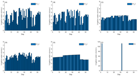 Daily irrigation amount in each experimental area: (A) describes the daily irrigation amount of T1 group; (B) describes the daily irrigation amount of T2 group; (C) describes the daily irrigation amount of T3 group; (D) describes the daily irrigation amount of T4 group; (E) describes the daily irrigation amount of T5 group; (F) describes the daily irrigation amount of T6 group.