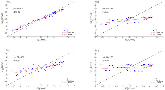 Figure 6C,D show a comparison of the correlation between the ETC data calculated for the T4 treatment, T5 treatment, and T1 treatment. The net radiation for both the T4 and T5 treatments was obtained through the HS model calculation. The difference between the T4 and T5 treatments is that the T4 treatment uses daily temperature data for model calculation, while the T5 treatment uses monthly average temperature data for model calculation. From the graph, the correlation between the ETC data calculated by the T4 treatment and T1 treatment is 0.65, and the correlation between the ETC data calculated by the T5 treatment and T1 treatment is 0.06. These findings suggest that the data consistency in the T4 treatment is much better than that observed in T5 treatment.