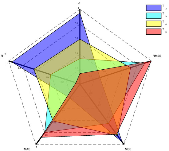 Based on the above analysis, it can be concluded that higher values of the coefficient of determination (R2) and the consistency index (d) correspond to a stronger correlation between the model’s calculated values and the actual values. Conversely, lower values of mean absolute error (MAE), mean deviation (MBE), and root mean square error (RMSE) indicate a reduced discrepancy between the model’s calculated values and the actual values. Based on the statistical results, the accuracy of the ETC calculation is as follows: T2 treatment > T4 treatment > T3 treatment > T5 treatment (Figure 7).