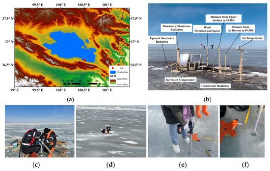(a) Overview of Qinghai Lake, with the observation location marked by a red pentagram. (b) Layout of the observational instrumentation. (c–f) Instrument setup, manual snow thickness measurements, and lake ice thickness measurements via drilling.