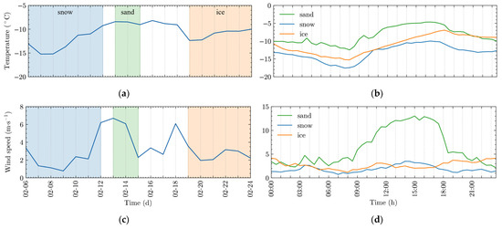 (a,c) Daily and (b,d) diurnal variations in (a,b) temperature and (c,d) wind speed at Qinghai Lake in 6–24 February 2022. The shaded areas in (a,c) correspond to the standard stages of lake cover: blue for snow, green for sand, and yellow for bare ice. Panels (b,d) display stage-averaged data for each variable. Note: Consistent with this article’s approach, the color coding in panels (a,c) is applied across all figures to represent the three distinct stages of the lake’s cover.