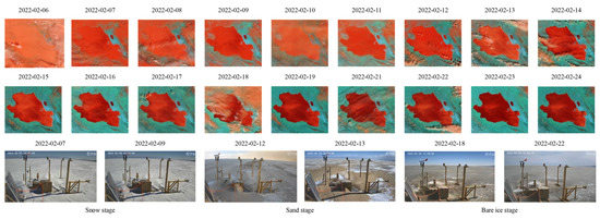Terra/MODIS images during the stable freezing period of Qinghai Lake in 6–24 February 2022, along with snapshots from the automatic weather station during the snow, sand, and bare ice stages. Two images from the automatic weather station are provided for each stage. The MODIS images are shown daily, except for 20 February, which has been removed due to distortion. Red corresponds to Band 3 (459–479 nm), green corresponds to Band 6 (1628–1652 nm), and blue corresponds to Band 7 (2105–2155 nm). Red areas represent ice and snow, cyan represents exposed soil, and white indicates small liquid water droplets in clouds. The lake surface is covered by a stable frozen ice layer.