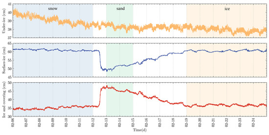The lake boundary comprises the coverings of snow or sand on the top and ice on the bottom. During the snow stage, the ultrasonic device was positioned 60.37~61.15 cm from the surface. The average thickness of ice and snow layers remained constant at 34.30~35.85 cm. The snow cover was relatively thin, around 2 cm.