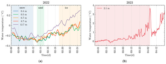 Temporal profiles of water temperature at various depths: (a) 12-hourly smoothed temperatures at 0.4 m, 0.5 m, 6.7 m, 8.7 m, and 12.7 m depths in February 2022; (b) 12-hourly smoothed temperatures at a depth of 2.1 m from February to April 2023, with the shaded area indicating the ice-covered period.