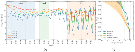 (a) Thirty-minute average lake ice temperature and (b) vertical temperature profile.