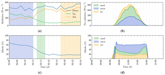 In the sand stage, the albedo of the sand-covered ice was low, leading to a sudden decrease from 0.49 to 0.37 in 12–13 February, while the corresponding upward shortwave radiation decreased from 93.94 to 53.54 W·m−2. By the 16 February, the sand cover remained on the ice surface, and the albedo continued to decrease, stabilizing at 0.15 due to the melting and deterioration of the snow present in the sand. The daily mean upwelling shortwave radiation further declined, reaching a minimum of 32.90 W·m−2 on 18 February in the sand stage. The average daily upward shortwave radiation in the sand stage varied greatly (32.90~93.94 W·m−2), and the albedo remained low (0.15~0.49).