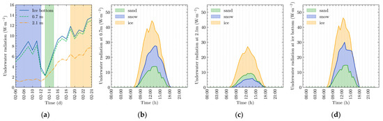 (a) Long-term trend and (b–d) daily variations in underwater radiation at depths of 0.7 m, 2.1 m, and the ice bottom.
