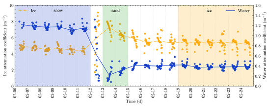 Temporal variation in the attenuation coefficients of the lake water (blue) and lake ice (yellow). Dots represent values at 10-minute intervals, and lines represent the daily average.