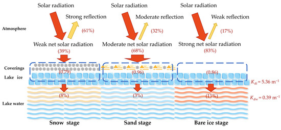 During the sand stage, the sand and superficial snow layer significantly reflected the incident solar radiation (32%), with the residual radiation absorbed by the intervening snow, sand, and ice layers (65%), resulting in minimal energy (3%, equivalent to 3.42 W·m−2) permeating the water body, aligning with the lowest observed lake water temperatures. In the snow-covered stage, the high reflectance of the snow (61%) led to a substantial reflection of downward radiation, coupled with absorption by the snow and ice layers (31%), thereby reducing the radiation reaching the water. Consequently, the underwater radiation during this stage was relatively diminutive, amounting to 7.44 W·m−2 (8%), which sustained the lake’s lower water temperature. In contrast, during the bare ice stage, the absence of coverings allowed solar radiation to be minimally reflected by the ice surface (17%) before being substantially absorbed by the ice layer (72%), thereby heating the shallow water adjacent to the underside of the ice. Ultimately, the incident radiation penetrated the water layer with the greatest intensity (11%, equivalent to 11.70 W·m−2), with this direct heating effect and enhanced radiation absorption contributing to a comparatively elevated lake water temperature, marking the highest temperatures during the bare ice stage.