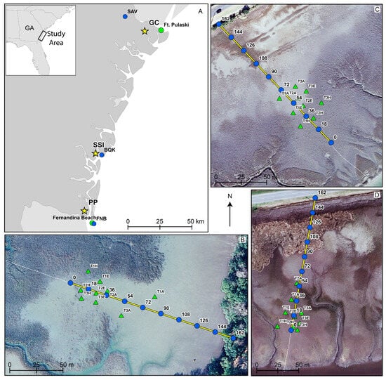 Site names were assigned based on location (Figure 1A), and abbreviations are as follows from north to south: Gray’s Creek (GC), St. Simons Island (SSI), and Point Peter (PP). For geospatial analyses presented below, all data used a common horizontal (North American Datum (NAD) 83(2011)/Universal Transverse Mercator (UTM) Zone 17N, European Petroleum Survey Group (EPSG): 6346) and North American Vertical Datum (NAVD) 88, GEOID 12A, EPSG: 5703) in unit meters. The GC site is located at 496,468.97mE 3,543,772.09mN (32.030289° N, 81.037223° W) near the city of Savannah. It is bounded by an urban housing development on the east and a tidal river called Grays Creek on the west (Figure 1B). S. alterniflora is the dominant vegetation at this site. The SSI site is located at 457,978.70mE 3,448,034.98mN (31.165996° N, 81.441708° W) off the F.J. Torras Causeway between St. Simons Island and the city of Brunswick (Figure 1C). This site is bordered by the F.J. Torras Causeway on the north–northwest and the tidal Mackay River on the south–southeast. Data from SSI were collected exclusively from S. alterniflora-dominated areas, avoiding areas with salt pans. Borrichia frutescens (sea ox-eye) and J. roemerianus are found along the upland border of the SSI site. The PP site is located at 449,154.00mE 3,403,002.81mN (30.759840° N, 81.531281° W) near the city of St. Marys and is bounded by the North River Causeway to the north and the tidal St. Marys River to the south (Figure 1D). In addition to S. alterniflora, J. roemerianus is present at this site near the causeway (Figure 1D), and both species are included in the ERT data at this site.