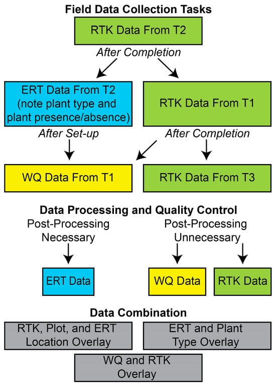 Flowchart showing field data collection tasks, data processing, and quality control, as well as data combination tasks to create data overlays (gray boxes) for the real-time kinematic (RTK) elevation and location information (green boxes), the electrical resistivity tomography (ERT) bulk resistivity data (blue boxes), and the water quality (WQ) data (yellow boxes).