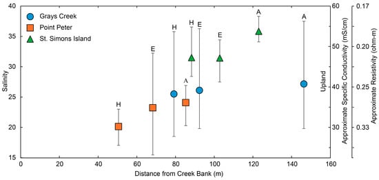 Salinity, approximate specific conductivity, and approximate resistivity of the transect one (T1) plot at each field site relative to the distance from the creek. Error bars show the range of salinity values measured quarterly at each plot from November 2014 through July 2016. “H” indicates healthy plots, “E” indicates transitional edge plots, and “A” indicates affected (dieback) plots.
