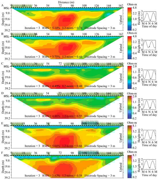 Below the unsaturated zone, the marsh hydrostratigraphic sequence at all sites indicated a resistivity change at ~0.8 m depth, transitioning to the lowest measured resistivity values (0.2 to 0.4 ohm-m), represented by blue hues in Figure 4A–F. We interpret this change as the top of the water table, which is located near the Earth’s surface, where the ERT resolution is higher due to the greater density of current paths. Although this depth is shallower than the vertical resolution of the ERT data, this interpretation is supported by field measurements from piezometers, which consistently yielded water from depths of 0.9 m and occasionally shallower (Table 3). These measurements also align with the expected location of the water table, which fluctuates around the mean sea level (MSL; Figure 4A–F). Both the piezometer data and the alignment with MSL provide ground-truth validation for the resistivity interpretation.