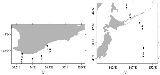- Zhabin, I.A.; Lukyanova, N.B. Results of monitoring oceanographic conditions off the east coast of Japan in March–April 2011 after the accident at the Fukushima-1 NPP. Bull. FEB RAS 2011, 6, 48–53. (In Russian) [Google Scholar]