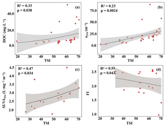 A significant positive correlation was found between DOC concentration and TSI (R2 = 0.33, p = 0.038; Figure 1a). In aquatic ecosystems, DOC can originate from various sources, including primary production by phytoplankton, decomposition of dead phytoplankton, and allochthonous inputs such as surface runoff and wastewater discharge. All of these processes contribute to the nutrient pool, which drives eutrophication [73,143,144]. Guan et al. (2024) observed that DOC concentrations in lakes and rivers of the Erhai watershed increased from 1.9 mg/L to 11.3 mg/L as the trophic states shifted from mesotrophic to middle-eutrophic [42]. This increase in DOC concentration with the eutrophication process has been reported in many reservoirs and rivers across varying trophic states [43,74]. These findings support the use of DOC as a potential indicator of eutrophication in freshwater ecosystems.