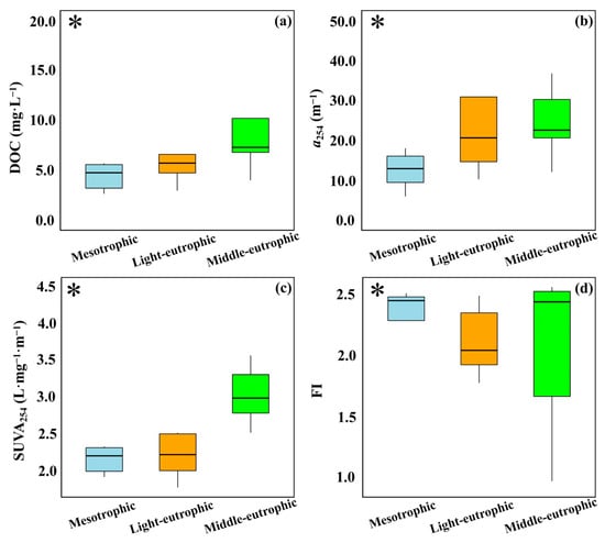 Box diagrams of DOC (a), a254 (b), SUVA254 (c), and FI (d) from different trophic states. Dunn’s test results show differences in these parameters (*: p < 0.05).