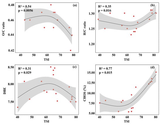 The GAM model results revealed that the H/C ratio, O/C ratio, double bond equivalency (DBE), and the proportion of CHOS molecules (CHOS%) of DOM molecules exhibit strong nonlinear correlations with the TSI (p < 0.05). Specifically, the O/C ratio shows a positive correlation with the TSI initially, followed by a negative correlation when the TSI exceeds 70 (R2 = 0.54, p = 0.0056; Figure 3a). The O/C ratio is a key parameter for characterizing the oxidation state and chemical composition of DOM molecules [108]. A higher O/C ratio typically indicates a greater degree of oxidation, characterized by an increased presence of polar functional groups, such as carboxyl and hydroxyl groups, which enhance the water solubility and reactivity of DOM [20,43]. This ratio also provides insights into the source of DOM; for example, terrestrial plant-derived organic matter typically exhibits a higher O/C ratio compared to algal-derived DOM [25]. Liu et al. (2020) investigated the O/C ratios of DOM from eutrophic Lake Taihu water-, macrophyte-, algae- and sediment-derived DOM and found that water- and macrophyte-derived DOM had higher O/C ratios compared to algal- and sediment-derived DOM [151]. The downward shift in the O/C ratio observed in our dataset when the TSI exceed 70 suggests a shift in the DOM source from terrestrial-dominant to algal-dominant in freshwater systems. Similarly, He et al. (2022) observed a similar pattern, where the O/C ratio increased and then decreased with increasing eutrophication across different sites in two eutrophic rivers [43].