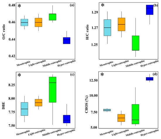Box diagrams of O/C ratio (a), H/C ratio (b), DBE (c), and CHOS (%) (d) from different trophic states. Dunn’s test results show differences in these parameters (*: p < 0.05).