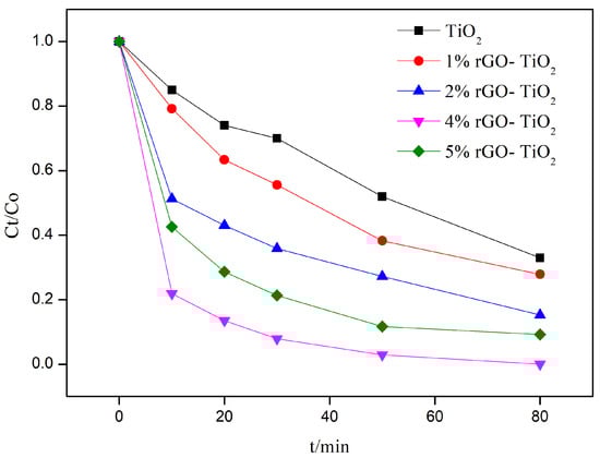 Figure 1 shows the photocatalytic activities of the samples for the removal of RhB under simulated sunlight irradiation. Compared to the photocatalytic performance of the nano-TiO2, the rGO-TiO2 composites displayed a considerable photocatalytic activity. Moreover, the photocatalytic activity of the rGO-TiO2 composites progressively improved as the rGO/TiO2 ratio increased from 1% to 4%. When the ratio further increased to 5%, the photocatalytic activity declined. The 4% rGO-TiO2 composites exhibited the best photocatalytic activity by achieving an RhB removal efficiency of 99.95% within 80 min, while the nano-TiO2 sample only achieved 66.88%. The first-order reaction rate constants (k) of these samples are listed in Table S1. The k of 4% rGO-TiO2 was 0.0867 min⁻1, 5.42 times higher than the k of the nano-TiO2 sample (0.0135 min⁻1). With an increasing rGO content in the rGO-TiO2 composites, there was an enhancement of the adsorptive properties which promoted a greater adsorption of organic pollutants on the catalyst’s surface, potentially elevating the photocatalytic efficiency [32]. However, at higher rGO concentrations, the excessive adsorption may saturate the active sites, detrimentally affecting the photocatalytic performance [33]. Concurrently, an increase in rGO may lead to aggregation, reducing the available surface area for photocatalysis and impeding the penetration of light to the TiO2 particles, thereby limiting the formation of critical electron–hole pairs [34,35].