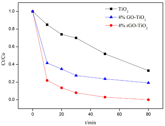 The photocatalytic activity of the nano-TiO2, 4% GO-TiO2, and 4% rGO-TiO2 samples are compared in Figure 2. It is apparent that the addition of GO strengthened the photocatalytic activity. Furthermore, the 4% rGO-TiO2 sample, prepared via the high-temperature vacuum annealing, exhibited the best photocatalytic activity. That is, the incorporation of GO combined with high-temperature vacuum annealing can lead to significant enhancement of the photocatalytic activity of TiO2.