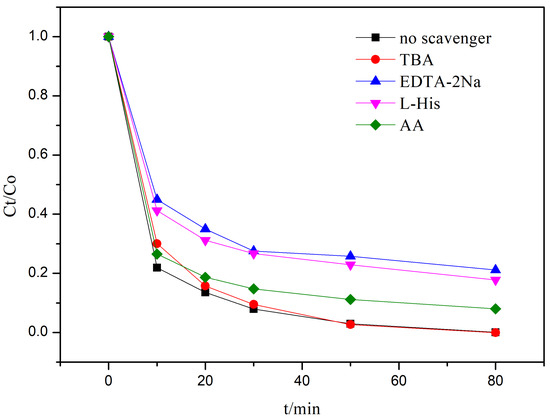 To investigate the key reactive species involved in the degradation process, the following experimental studies were conducted. Generally, the main reactive species in photocatalytic processes include hydroxyl radicals (·OH), superoxide radicals (·O2), photogenerated holes (h+), and singlet oxygen (1O2) [36,37,38,39]. In this study, tertiary butyl alcohol (TBA) [37], ascorbic acid (AA) [39], disodium ethylenediaminetetraacetate (EDTA-2Na) [36], and L-histidine (L-His) [38] were used as scavengers for the reactive species, respectively, and the results are shown in Figure 3. The addition of TBA had no significant effect on the photocatalytic activity of the 4% rGO-TiO2 composite, indicating that hydroxyl radicals are not the primary reactive species. When AA, L-His, and EDTA-2Na were used, the degradation efficiency of RhB decreased to 92.03%, 82.25%, and 78.87%, respectively. These results demonstrate that h+ and 1O2 are the primary reactive species, while ·O2 plays a lesser role in the degradation process.