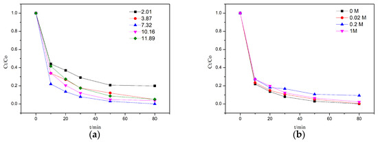 Figure 4a,b illustrate the degradation efficiency of the 4% rGO-TiO2 in response to pH and NaCl concentration. The results indicate that the degradation efficiency of the 4% rGO-TiO2 was mildly influenced by the pH, with the highest efficiency observed under neutral conditions, followed by alkaline conditions, and the lowest under acidic conditions. At a pH of 11.89, the degradation efficiency reached 94.90% within 80 min, whereas at a pH of 2.01, it was only 80.14%. The surface charge of the 4% rGO-TiO2 and the pKa value of RhB, by modulating the electrostatic interactions between them, partially influenced the degradation process [40]. The point of zero charge (PZC) for the 4% rGO-TiO2 was calculated to be ≈3.47, and the pKa value of RhB was ≈3.72. When the pH value increased beyond PZC (pH > 3.47), the surface of the 4% rGO-TiO2 became negatively charged, while at lower pH values (pH < 3.47) the surface became positively charged. The same phenomenon is applicable to the pKa value of RhB [40,41]. At pH = 2.01, the surface of the 4% rGO-TiO2 and RhB were both positively charged, so there was electrostatic repulsion between the 4% rGO-TiO2 and RhB. However, the electrostatic forces were not the only interactions between the 4% rGO-TiO2 and the RhB; hydrogen bonding, π-π conjugation, and Van Der Waals forces also played important roles [42,43]. The O₂ preferentially adsorbs onto the negatively charged surface of the catalyst and would, subsequently, be oxidized into ·O2 [44,45,46]. Additionally, the concentration of ·O2 is considered to be pH-dependent, with alkaline conditions favoring their production, while acidic conditions inhibit it [47]. The ·O2 is an important precursor for the generation of 1O2 [48,49,50]. However, as the pH increased, both the 4% rGO-TiO2 and the RhB acquired more negative charges, leading to increased electrostatic repulsion between them. Consequently, alkaline conditions were not necessarily optimal for this process. Figure 4b demonstrates that the degradation efficiency of the 4% rGO-TiO2 composite was largely unaffected by NaCl concentrations. The 4% rGO-TiO2 composite can be used for photocatalytic degradation of high-salinity organic wastewater.