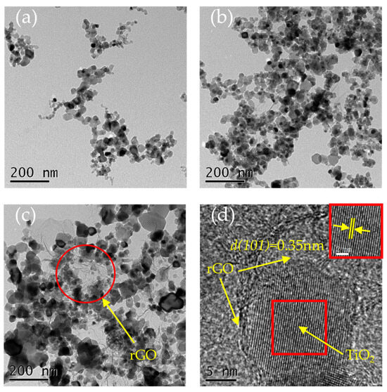 Figure 5 shows the TEM images of the nano-TiO2, 4% GO-TiO2, and 4% rGO-TiO2. The sizes of the nano-TiO2 were in the range of 10–25 nm (Figure 5a). After the incorporation of GO, the sizes joined the range of 15–30 nm (Figure 5b). Vacuum annealing was able to induce the agglomeration of the 4% rGO-TiO2 nanoparticles (Figure 5c), which is consistent with the SEM images in Figure S5. The sizes of the 4% rGO-TiO2 nanoparticles underwent an obvious growth and joined the range of 20–35 nm. That is, 4% rGO-TiO2 nanoparticles had a tendency of crystal growth by vacuum annealing. The high-magnification TEM image of the 4% rGO-TiO2 in Figure 5d shows the TiO2 nanoparticle coated with the rGO. The lattice fringes of the TiO2 nanoparticle are also clearly observed. The lattice spacing was 0.35 nm (the inset of Figure 5d), corresponding to the (101) planes of the anatase TiO2.
