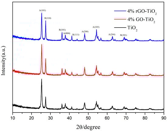 Figure 6 shows the XRD patterns of the nano-TiO2, 4% GO-TiO2, and 4% rGO-TiO2 samples. The diffraction peaks at 25.3°, 37.9°, 48.0°, 54.1°, and 62.7° corresponded to the (101), (004), (200), (105), and (204) planes of the anatase TiO2, respectively. The peaks at 27.4°, 36.1°, 41.2°, and 69.0° were attributed to the (110), (101), (111), and (301) planes of the rutile TiO2, respectively [14,52]. This indicates that the nano-TiO2 was a mixture of anatase and rutile. No diffraction peaks for GO or rGO were observed in the 4% GO-TiO2 and 4% rGO-TiO2 samples, likely because of their low concentrations [32,53]. Moreover, the diffraction peak at 24.4° for rGO was close to the anatase TiO2 (101) peak at 25.3°, a phenomenon which caused the overlapping of the rGO diffraction peak in the 4% rGO-TiO2 composites [53]. As shown in Figure 6, compared with the intensities of the anatase TiO2 diffraction peaks, the relative intensities of the rutile TiO2 diffraction peaks were enhanced after vacuum annealing, indicating that some of the anatase samples were transformed into rutile (see Table S2) [14,54,55,56]. Moreover, using the Debye–Scherrer formula [57], the average crystallite sizes shown in Table S2 increased following the addition of GO and the high-temperature annealing, a phenomenon which is in consistent with the TEM observation.