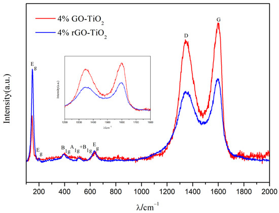 Figure 7 shows the Raman spectra of the 4% GO-TiO2 and 4% rGO-TiO2 samples. The five bands at 144 cm⁻1, 197 cm⁻1, 399 cm⁻1, 520 cm⁻1, and 637 cm⁻1 corresponded to the five active vibrational modes Eg, Eg, B1g, A1g + B1g, and Eg of the anatase TiO2, confirmed as the dominant crystalline phase, consistent with the XRD results [51,58]. The D band (1360 cm⁻1) and G band (1590 cm⁻1) characteristics of GO and rGO were prominent, indicating the existence of GO and rGO coatings on TiO2. Moreover, the ID/IG ratios of the 4% rGO-TiO2 was 0.84, lower than that of the 4% GO-TiO2 (0.89), a phenomenon which was attributed to the removal of oxygen functional groups during annealing [59]. The FTIR analysis in Figure S7 can also confirm the reduction of GO.